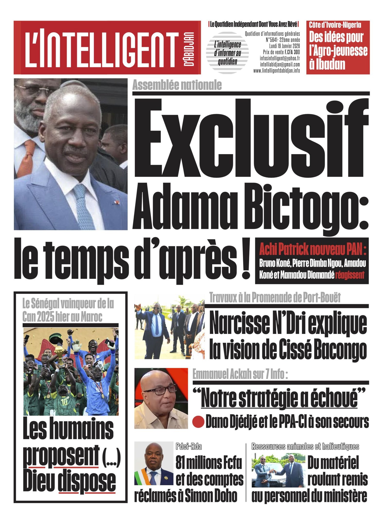 À lire aussi Achi Patrick nouveau PAN : Bruno Koné, Pierre Dimba Ngou, Amadou Koné et Mamadou Diomandé réagissent; Le Sénégal vainqueur de la Can 2025 hier au Maroc , Les humains proposent (…) Dieu dispose, Narcisse N’Dri explique la vision de Cissé Bacongo concernant les travaux à la Promenade de Port-Bouët; ce que Emmanuel Ackah a dit sur 7 Info; 81 millions Fcfa et des comptes réclamés à Simon Doho.