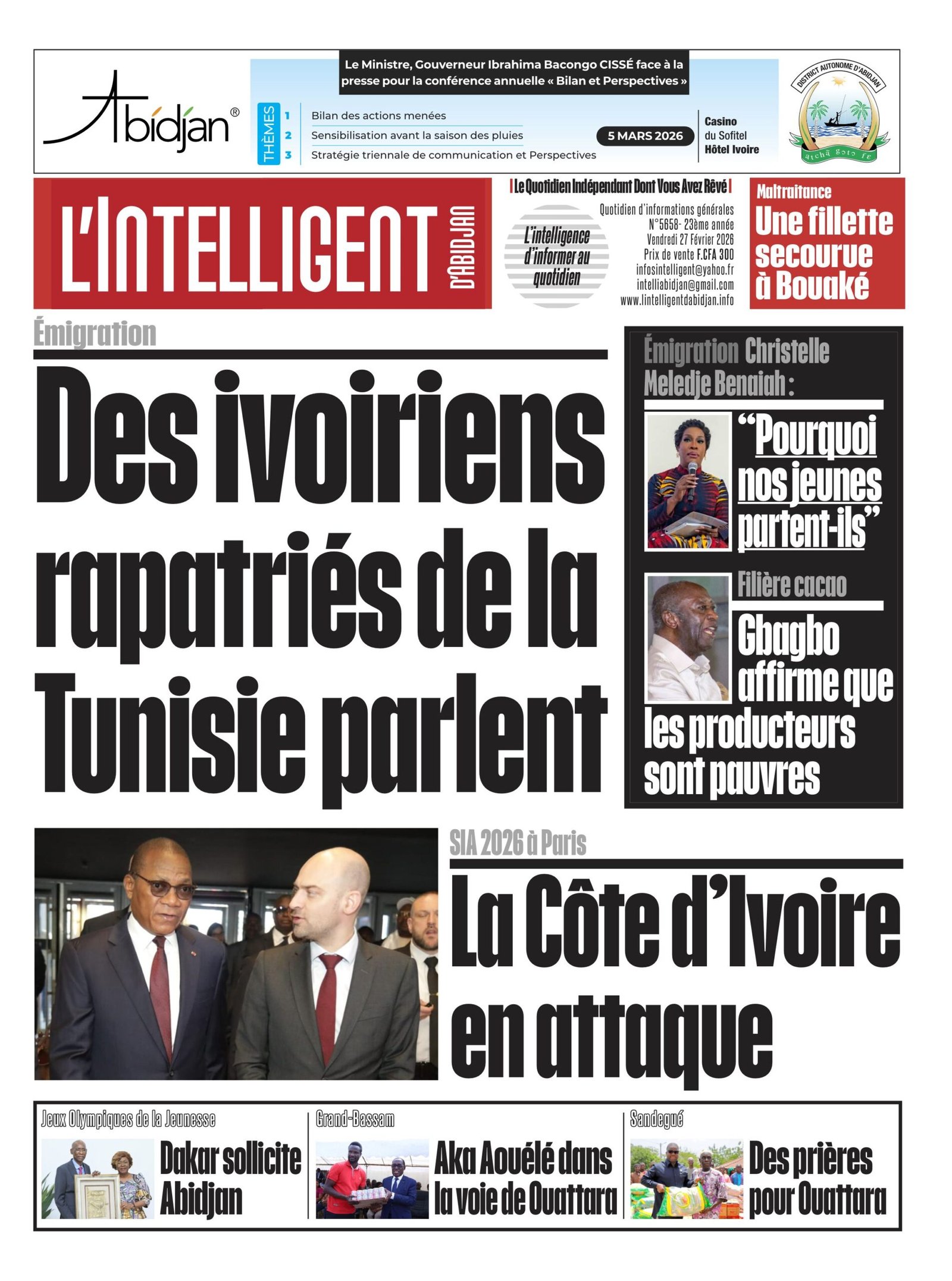 À lire aussi la Côte d’Ivoire en attaque au SIA 2026 à Paris, ce que Christelle Meledje Benaiah dit de l’émigration; Gbagbo affirme que les producteurs du cacao sont pauvres; Dakar sollicite Abidjan dans le cadre des Jeux Olympiques de la Jeunesse; Aka Aouélé dans la voie de Ouattara à Grand-Bassam.
