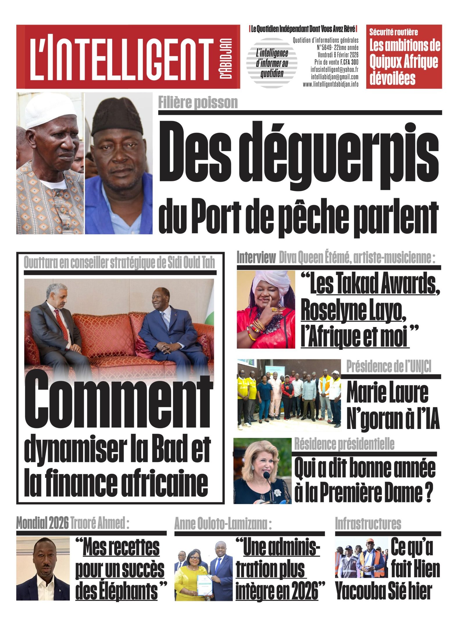 À lire aussi Ouattara en conseiller stratégique de Sidi Ould Tah , comment dynamiser la Bad et la finance africaine, l’interview de Diva Queen Étémé, artiste-musicienne et celle de Traoré Ahmed (Leader Foot Académie) , la visite à l’IA de Marie‑Laure N’goran, candidate au congrès de l’UNJCI ; Anne Ouloto pour une administration plus intègre en 2026; Qui a dit bonne année à la Première Dame ? et ce qu’a fait Hien Yacouba Sié hier .