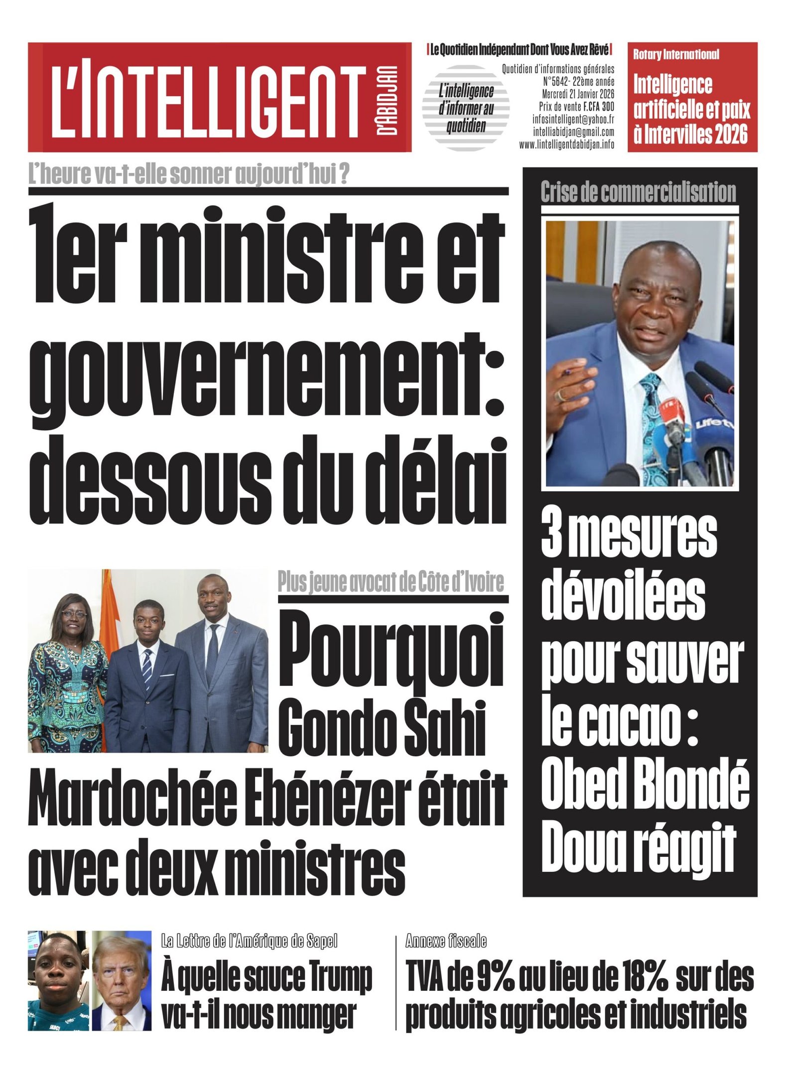 À lire aussi les 3 mesures dévoilées pour sauver le cacao et la réaction de Obed Blondé Doua ; Pourquoi Gondo Sahi Mardochée Ebénézer , le plus jeune avocat de Côte d’Ivoire était avec deux ministres; La Lettre de l’Amérique de Sapel ” À quelle sauce Trump va-t-il nous manger”; TVA de 9% au lieu de 18% sur des produits agricoles et industriels au niveau de l’ Annexe fiscale.