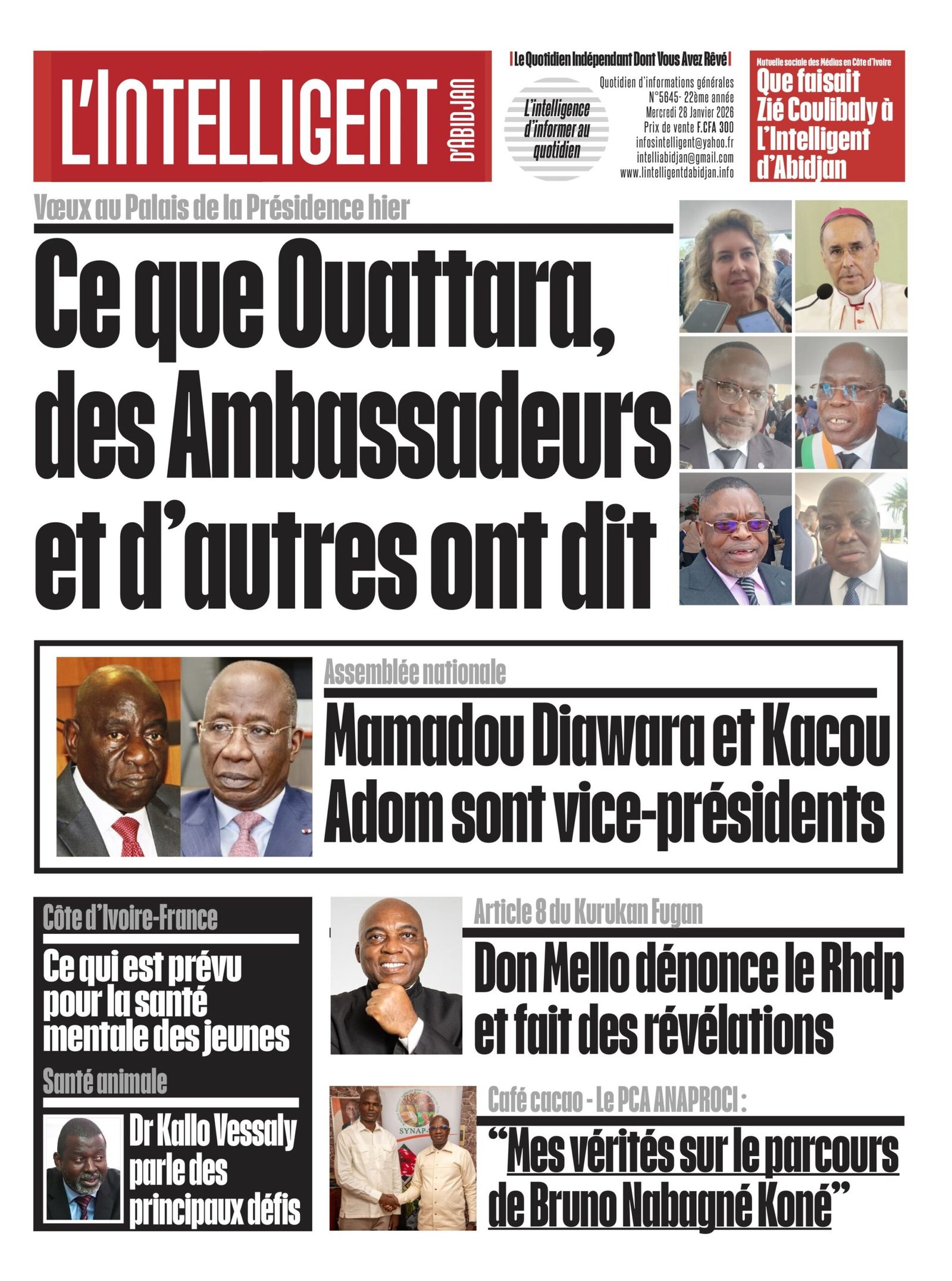 À lire aussi Diawara et Kacou Adom sont vice-présidents de l’Assemblée nationale; Don Mello dénonce le Rhdp et fait des révélations sur l’article 8 du Kurukan Fugan; ce que le PCA de l’ANAPROCI a dit sur le parcours de Bruno Koné; Ce qui est prévu pour la santé mentale des jeunes; Dr Kallo Vessaly parle des principaux défis de la santé animale.