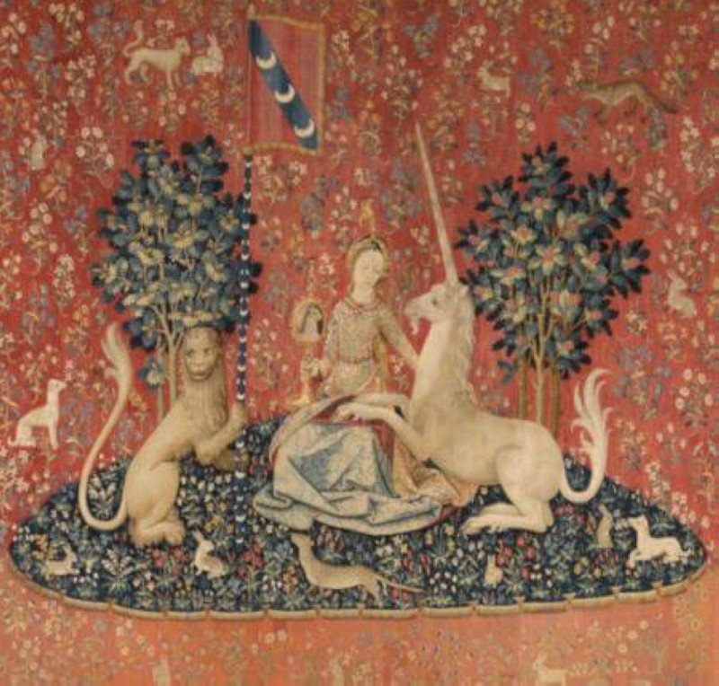 La licorne fait sa première apparition dans la célèbre série de tapisseries « La Dame à la Licorne », réalisée vers 1500. Cette tenture représente une femme, accompagnée d’une créature imaginaire : un cheval blanc à la barbichette de bouc, aux pieds fourchus et portant une corne sur la tête.